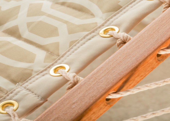 This hammock features a soothing stripe design made of printed polyester. The double layer of fabric is mold and mildew resistant and matches with a variety of color schemes. The spreader bar is made of hardwood for strength, stability, quality, and design and is sanded and varnished for water repellence. For added unique style, the fabric wraps around the spreader bar.