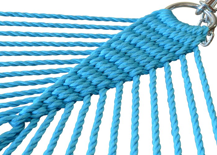 This hammock is handmade from soft-spun polyester that is solution-dyed to bring you the brightest color possible. This hammock is just as comfortable as a cotton hammock, but is more durable outdoors. Measuring a total 12 feet from ring to ring, plus 12 inches of zinc-plated extension chain attached to each ring knot, this hammock is 55 inches wide with an 84 inch bed length and is perfect for two people to kick back and relax.